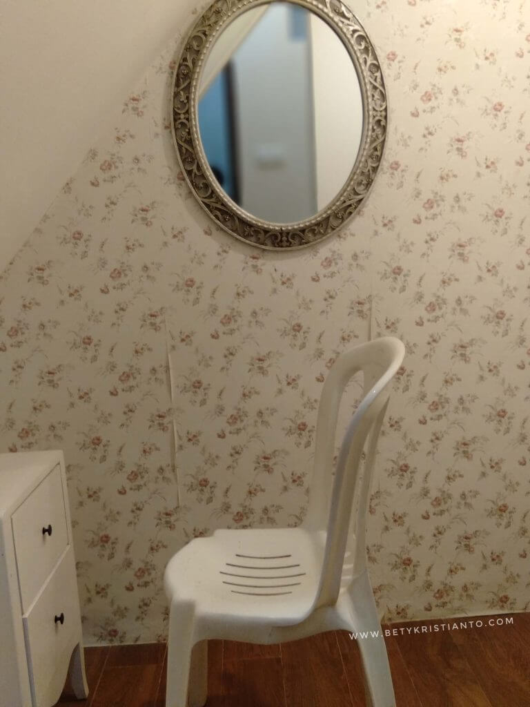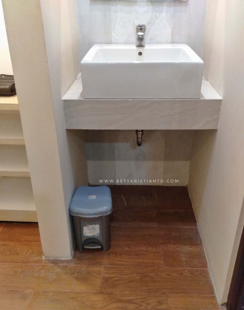 Di belakang bed utama, ada kamar mandi lengkap dengan shower air hangat. Sementara di seberangnya ada ruang kecil untuk bersolek atau sekedar berganti baju. Cuma sayang, ruang ini terlalu sempit karena terletak di bawah tangga menuju ke lantai atasnya.