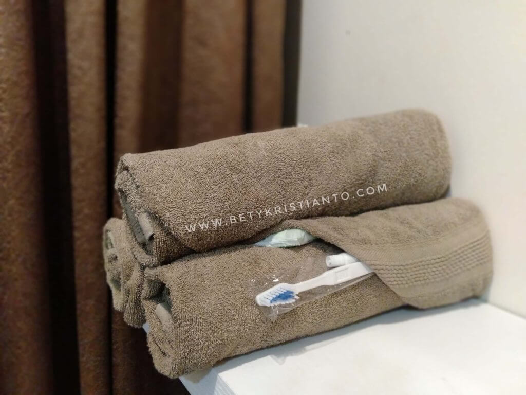 Waktu booking, kami emang pilih kamar yang muat untuk 3 orang dewasa. Jadi, ada 1 bed besar dan 1 lagi yang ukurannya lebih kecil. Ada sofa yang bisa dipakai duduk santai, jendela berkaca lebar yang bisa dibuka, TV, dan rak kecil tempat kita bisa meletakkan barang-barang sperti handphone, tas kecil, dan lain-lain. Sebagai compliment, disediakan 2 botol air mineral, beberapa bungkus mi gelas dan biskuit.