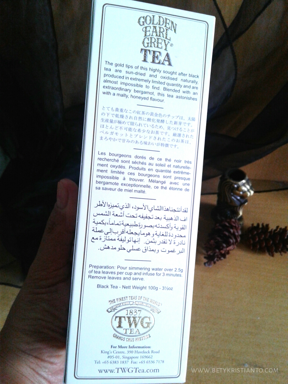 Saking penasarannya, saya langsung buka lagi deh ni buku kecil nan sakti. Ternyata aroma dan rasa yang dihasilkan itu berasal dari campuran daun teh, bergamor, madu dan malty flavour. Cita rasa terakhir ini susah buanget nyari artinya. Sampe saya harus gugling dulu hahaha. Niaaat nyakk.